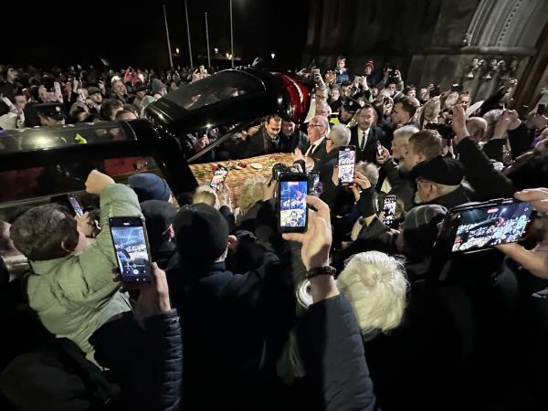 周五晚上,在群星荟萃的仪式结束后,沙恩的柳条篮子棺材从玫瑰教堂的圣玛丽教堂被带到瑞恩在镇上的殡仪馆,并在那里过夜。